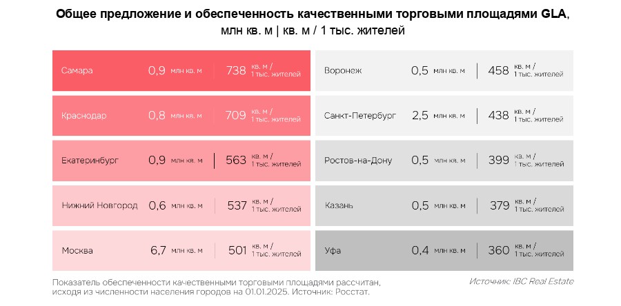 Уровень обеспеченности качественной торговой недвижимостью по России составляет 182 кв. метра на одну тысячу жителей. В зависимости от города, показатель варьируется и может достигать 738 кв. метров. Лидер – Самара, где показатель в 4 раза выше, чем в целом по стране. Москва находится на пятом месте (501 кв. метр) Петербург – на седьмом (438 кв. метров).