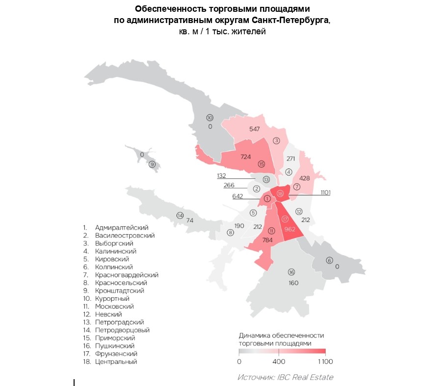 Наиболее обеспеченные районы Петербурга – Центральный (1101 кв. м), Фрунзенский (962 кв. м), Московский (784 кв. м) и Приморский (724 кв. м), что обусловлено расположением крупных ТЦ – например, МЕГА Дыбенко (140 тыс. кв. м), Галерея (97 тыс. кв. м), Питерлэнд (83 тыс. кв. м), Лето (76 тыс. кв. м).