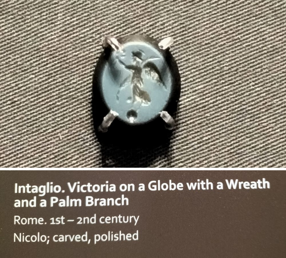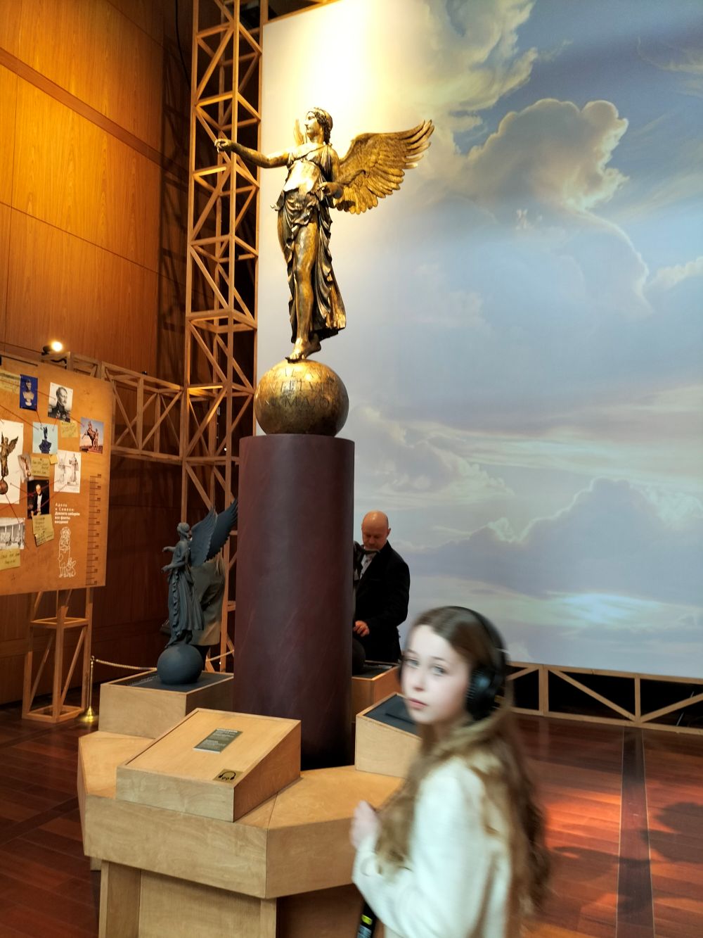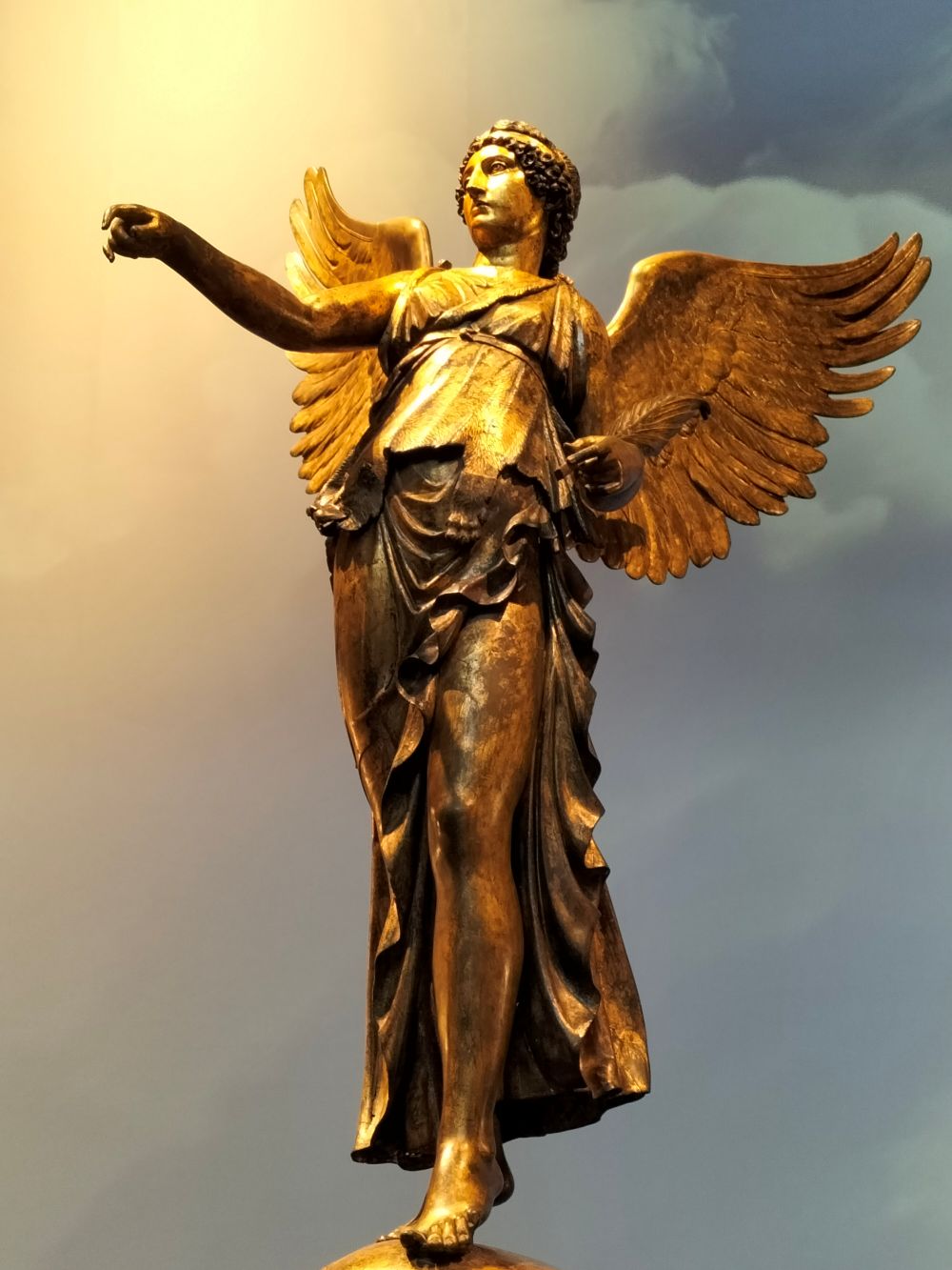 В 2018 году Игорь Малкиель, куратор проекта, заведующий Лабораторией научной реставрации драгоценных и археологических металлов Эрмитажа, опубликовал результаты исследования «трофейной» статуи, которая долгое время считалось произведением XVII века. Античная бронзовая статуя, точнее, ее фрагменты – голову, туловище, правую ногу и шар с надписью на латыни «Победе двух императоров – Антонина и Вера – М Сатрий Старший» – нашли в провинции Кальватоне в Италии в 1836 году. В начале 1840-х годов статую приобрел Королевский музей в Берлине. Перед этим скульптура подверглась реставрации. Были добавлены отсутствовавшие ранее крылья. В 1946 году статуя была перевезена в Советский Союз в рамках компенсаторной реституции. Детальное исследование статуи после войны было невозможно, поскольку при советской власти она находилась в режиме особого хранения. Подробнее – тут.