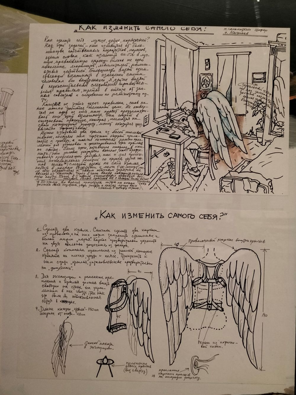Кроме того, в одном из соседних залов Главного штаба 22 февраля закрылась капитальная выставка «Илья и Эмилия Кабаковы. «Памятник исчезнувшей цивилизации», которая работала более полутора лет. Там, на одном из стендов был помещен проект для кабаковского музея исчезнувшей цивилизации «Как изменить самого себя». Он удивительным образом рифмуется с историей обретения крыльев Викторией Кальватоне.