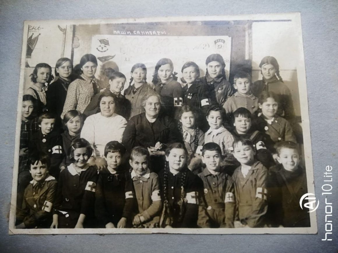 - Санитары школы № 16 г. Ленинграда. Первая слева в нижнем ряду – Наташа Соболева. Четвертая слева в том же ряду – Таня Савичева
