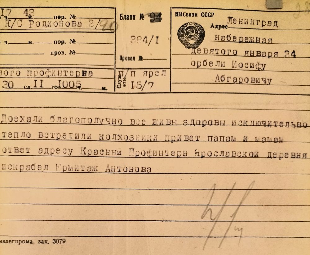 - Телеграмма Л.Антоновой И.Орбели из Красного Профинтерна (Ярославская область). 1941 г.