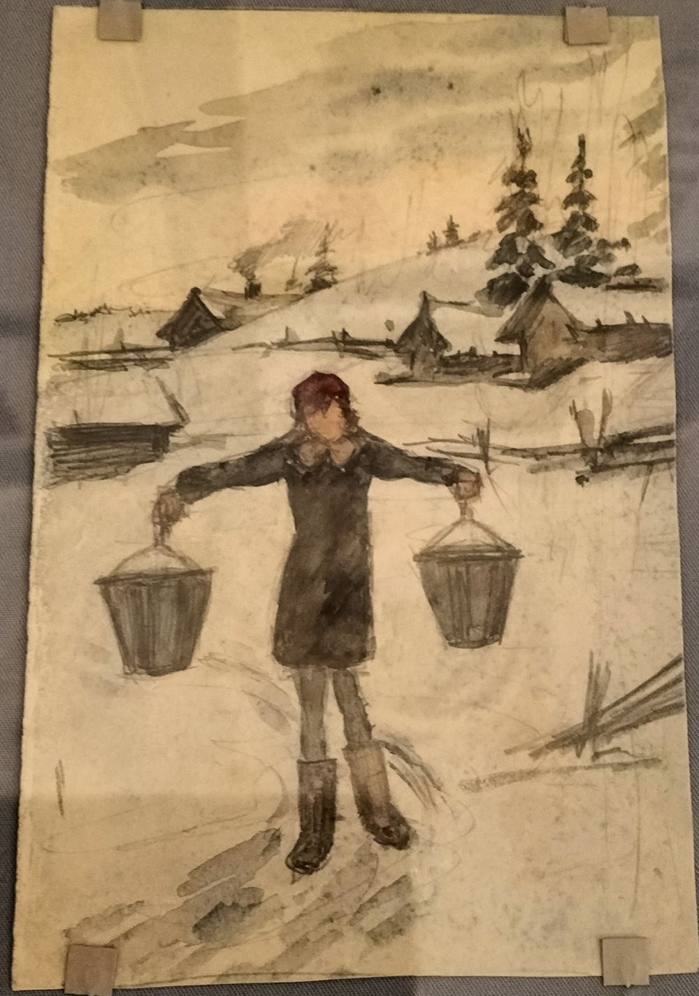 Поразителен рисунок на разворот тетради «Зима в Лядах». Невозможно отделаться от ощущения, что автор видел репродукцию картины «Возвращение с охоты» Питера Брейгеля Старшего. Как знать, все-таки интернат был эрмитажным.