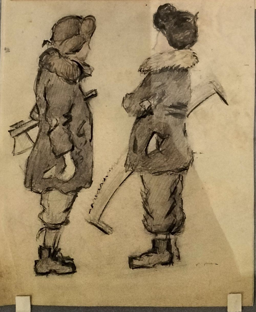 Поразителен рисунок на разворот тетради «Зима в Лядах». Невозможно отделаться от ощущения, что автор видел репродукцию картины «Возвращение с охоты» Питера Брейгеля Старшего. Как знать, все-таки интернат был эрмитажным.