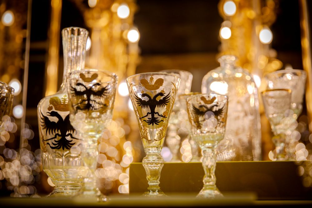 В числе раритетов – предметы из Царскосельского хрустального сервиза «с черными орлами», созданного к 300-летию Дома Романовых. Во время Великой Отечественной войны в эвакуацию не удалось вывезти ни одного экземпляра «питейного стекла».