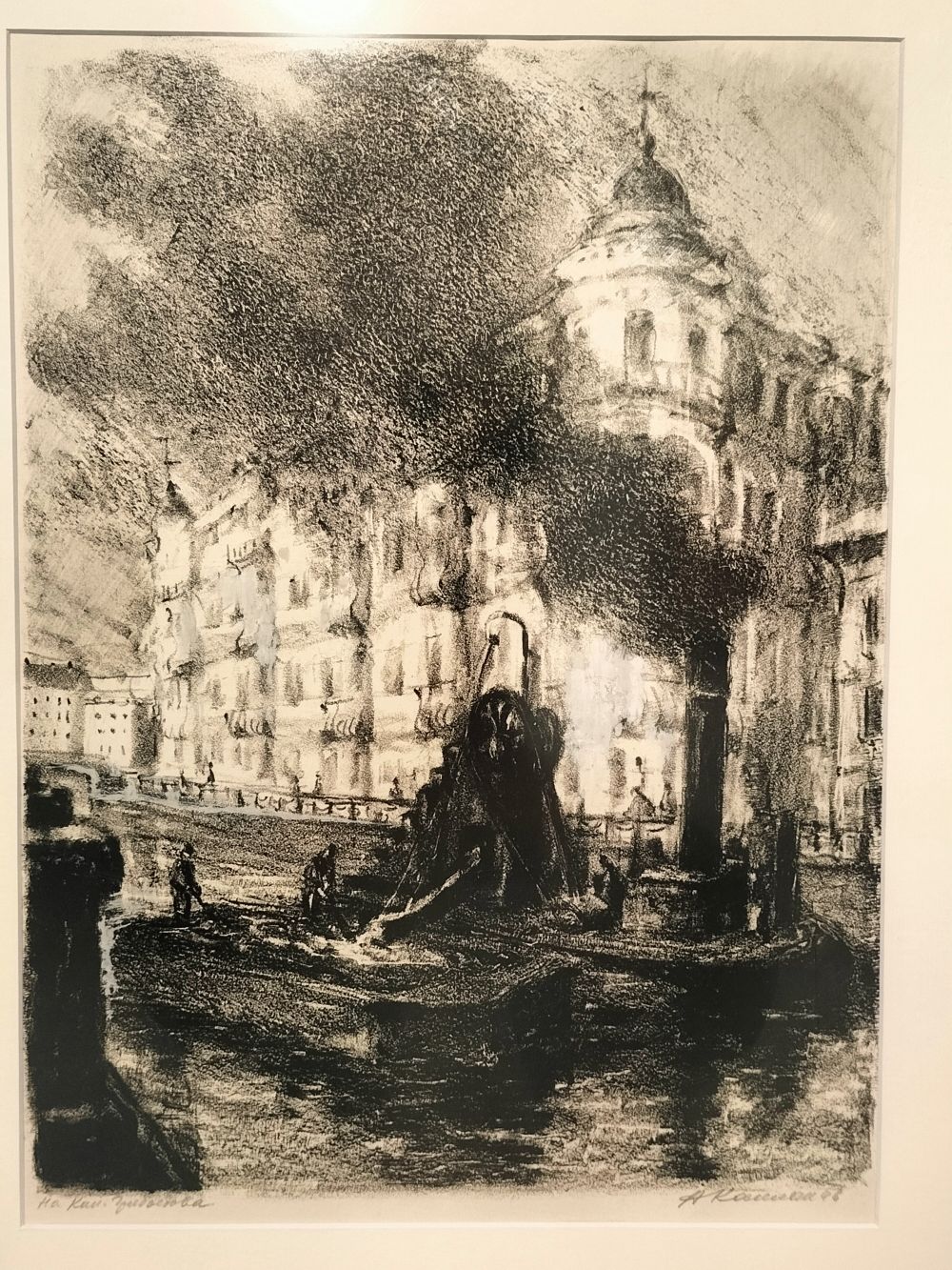 Художник вернулся из эвакуации в Ленинград в 1944 году, сделал серию потрясающих литографий, связанных с восстановлением города. И, что называется, проснулся знаменитым.