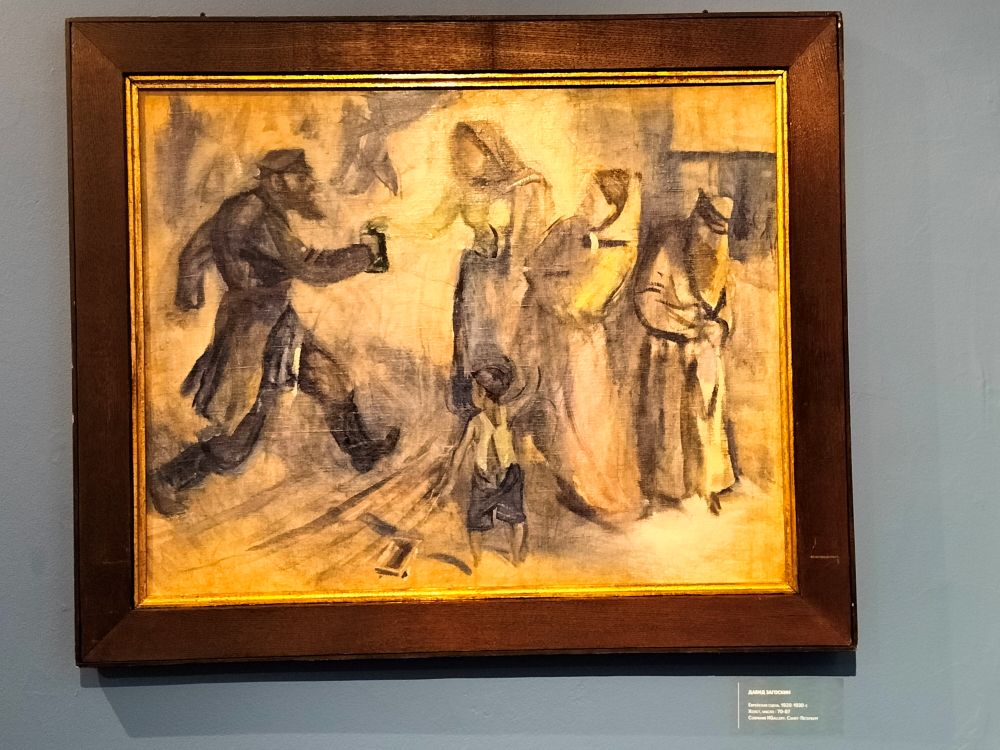 Художник погиб в блокаду совсем не старым человеком и немного его работ сохранилось. Эта одна из самых лучших. Похороны. На заднем плане на носилках несут умершего. «Шамес», служка синагогальный, бежит вдоль похоронной процессии и собирает пожертвования на бедных.