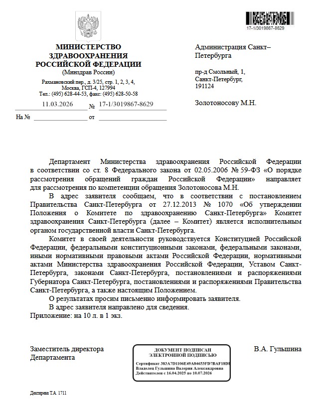 Однако самое интересное, что прошло уже три недели, а в Администрации СПб письмо из Министерства здравоохранения так и не получили! Я звонил сегодня, 2 апреля 2026 г. в обе канцелярии Администрации: и для частных отправителей (тел. 576–78–06), и для служебной переписки (тел. 576–74–33). Письмо Минздрава в Смольный не зарегистрировано нигде. То ли не было отправлено, то ли потерялось по дороге, то ли все еще идет, хотя прошло 22 дня.