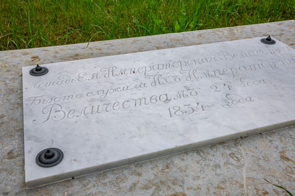 На кладбище XIX века захоронены более 120 лошадей российских императоров. Реставрация комплекса началась в 2019 году на внебюджетные средства музея – за это время полностью восстановили общую планировку, отреставрировали основания надгробий и вернули могильные плиты на исторические места. Научные сотрудники музея по архивным данным установили клички животных, мастера воссоздали утраченные плиты с надписями.