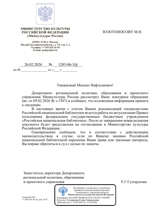 Заместитель директора Департамента региональной политики, образования и проектного управления Министерства культуры РФ Е.Г.Сухорукова направила мою жалобу генеральному директору РНБ (далее – Директор), а его посильные размышления переслала мне. Директор нарушений в действиях Чекаловой не выявил, о чем указал в письме, и тем самым подтвердил, что согласен с нарушением Правил, которое 26 января 2026 г. сначала допустила младший сержант Максимова, а затем не предотвратила зав. Группой ответственного дежурного Чекалова, которая внимательно осмотрела мой фотоаппарат, извлеченный из футляра.