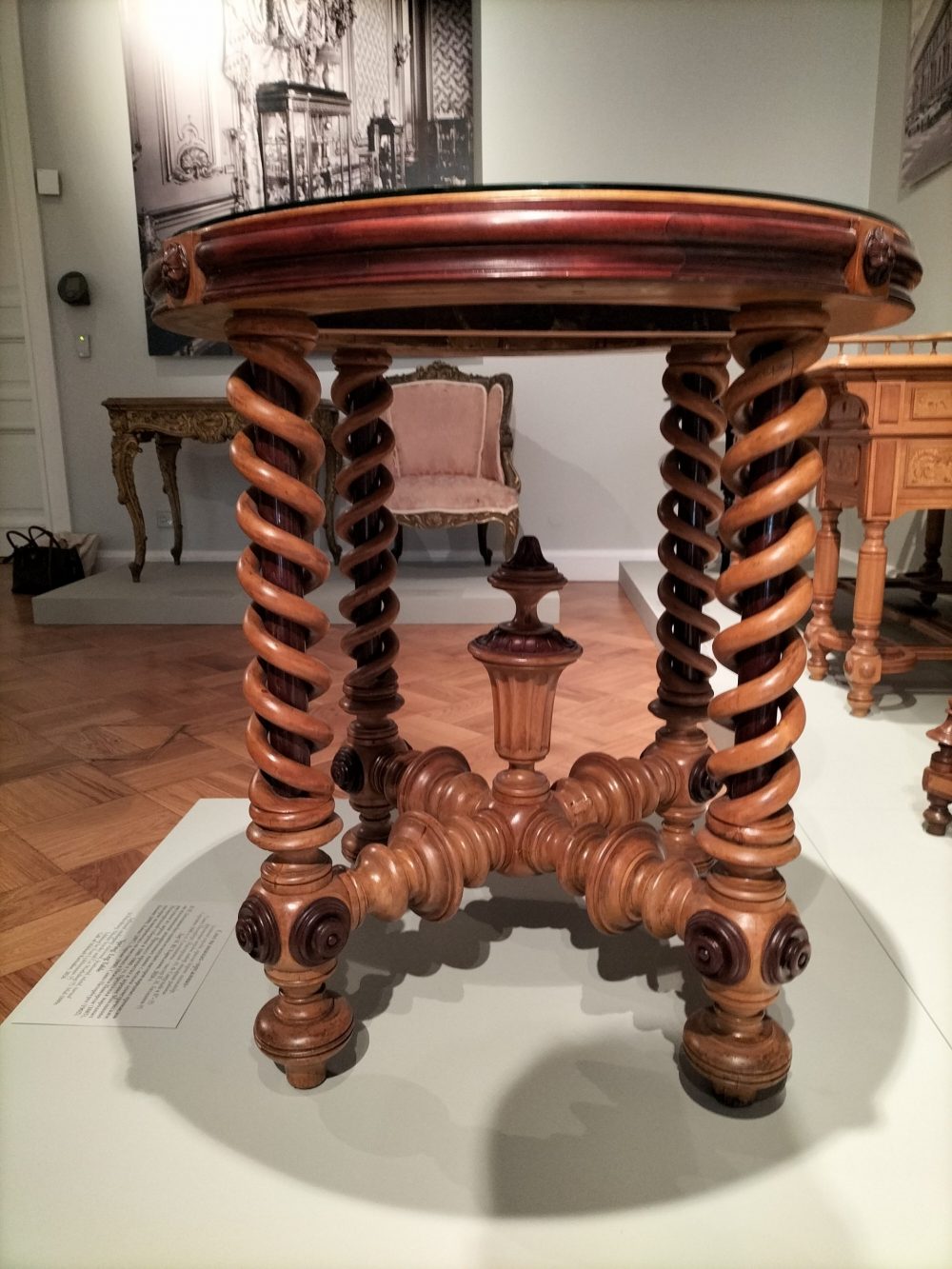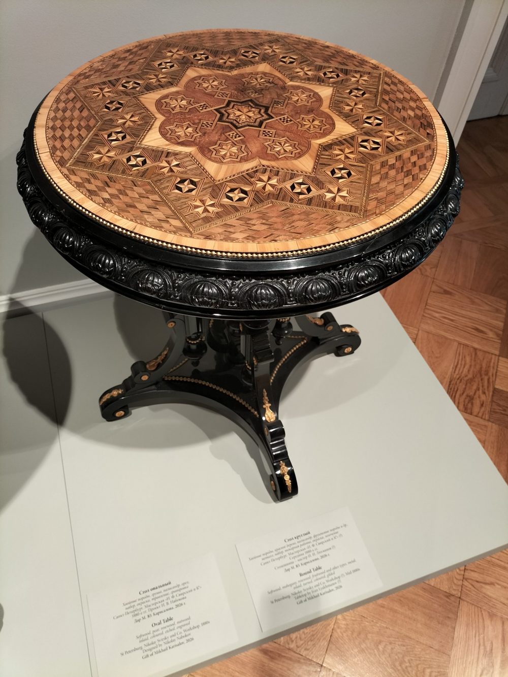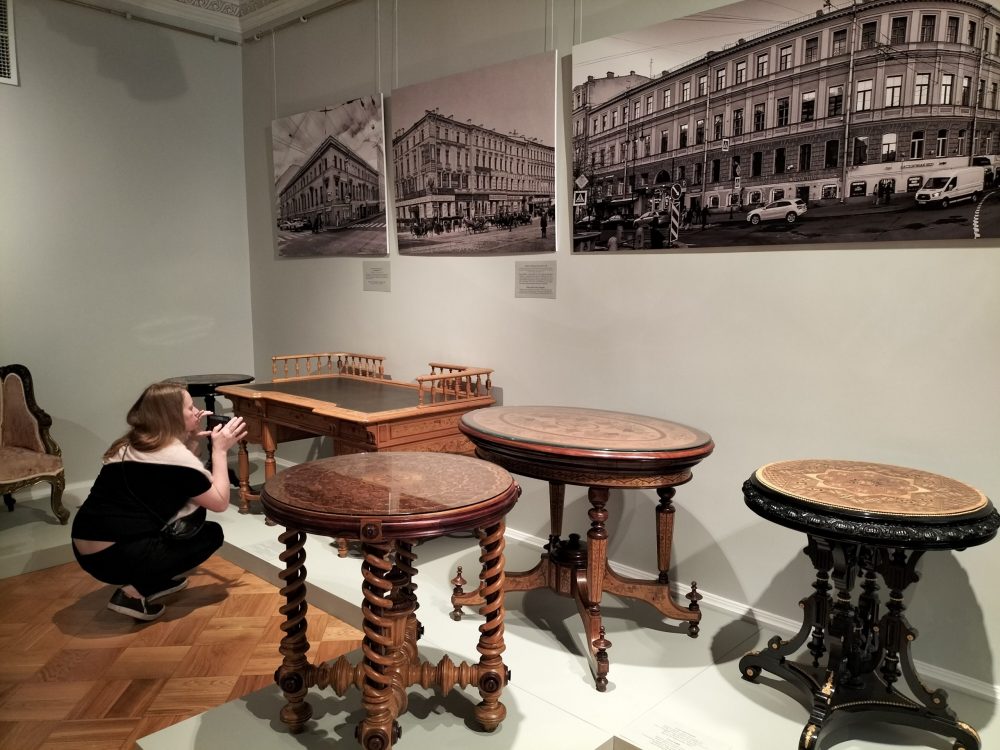 На выставке показаны несколько круглых столиков, украшенных мозаиками, а один еще и на ножках – «пружинах». Они недавно подарены Эрмитажу известным меценатом Михаилом Карисаловым.