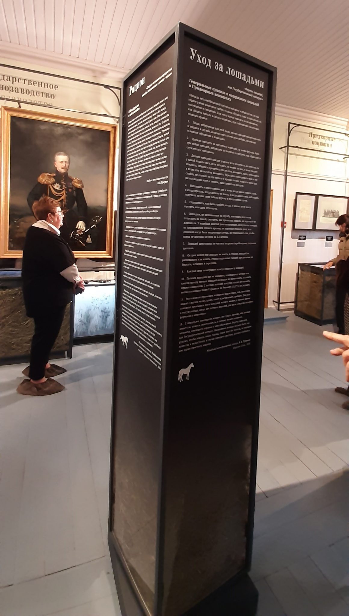 Посетителям помогут представить, как выглядели лошади российских императоров, живописные конские портреты. Среди экспонатов — полотно Франца Крюгера «Император Николай I со свитой», портреты Николая II кисти Александра Маковского и другие.
