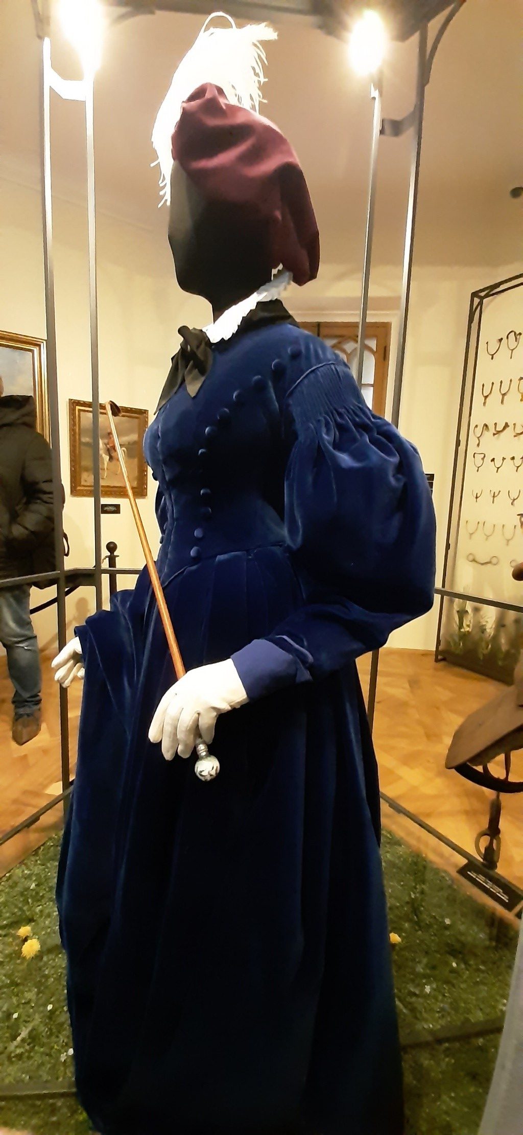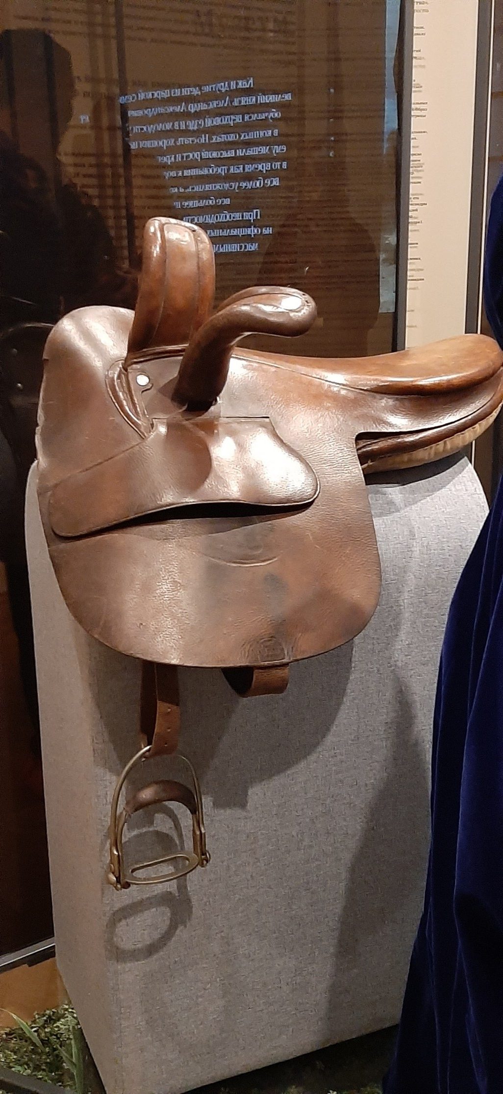 Рядом с костюмом расположились подлинные вещи: дамское одностороннее седло, стремена и хлыст.