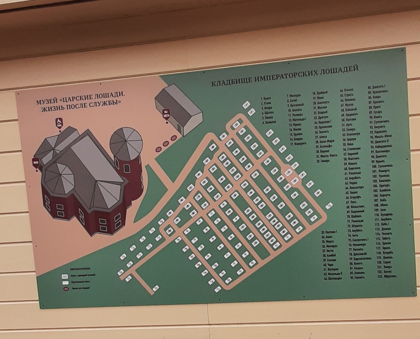 Основные захоронения лошадей, а это сто двадцать три могилы, восстановлены по архивным документам. Именно кладбище, в отличие от самого здания конюшни, пострадало больше всего во время Великой Отечественной войны и в послевоенное время. Это не все захоронения: какие-то могилы потеряны, и восстановить их не удалось. Одни плиты содержат эпитафии, другие — только кличку и годы жизни лошади. Надписи на плитах воспроизведены согласно найденным историческим справкам в архивах.