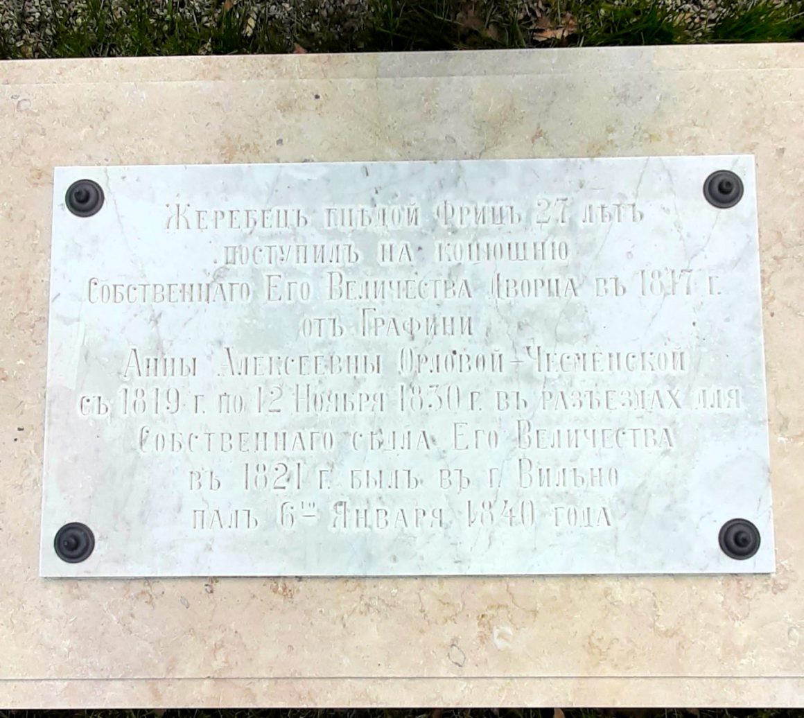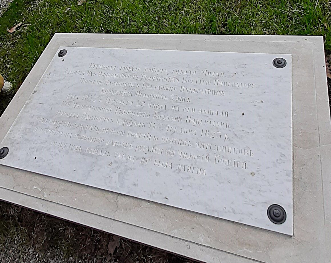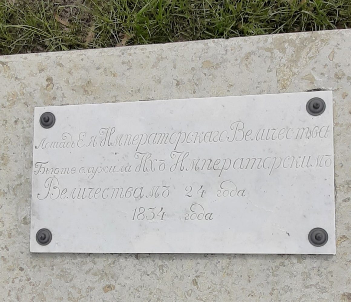 Кстати, Серко — конь амурской породы серой масти — и арабский красавец Амалатбек, похороненный здесь же, служили моделями скульптору Петру Клодту при изготовлении знаменитых коней Аничкова моста.