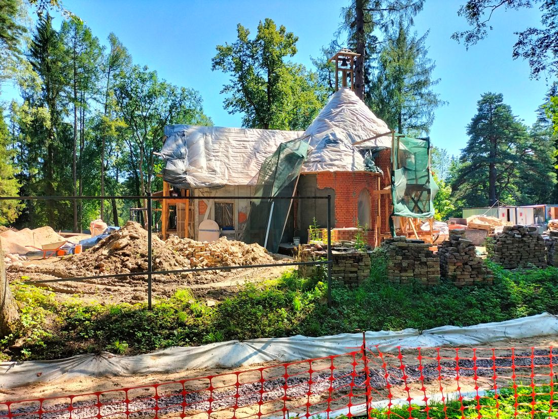 Сейчас восстановлен кирпичный объем, штукатурка сделана с прорехами, имитирующими осыпание от старины (забава конца XVIII века). Подобран специально обработанный противопожарный тростник, который будет имитировать солому.