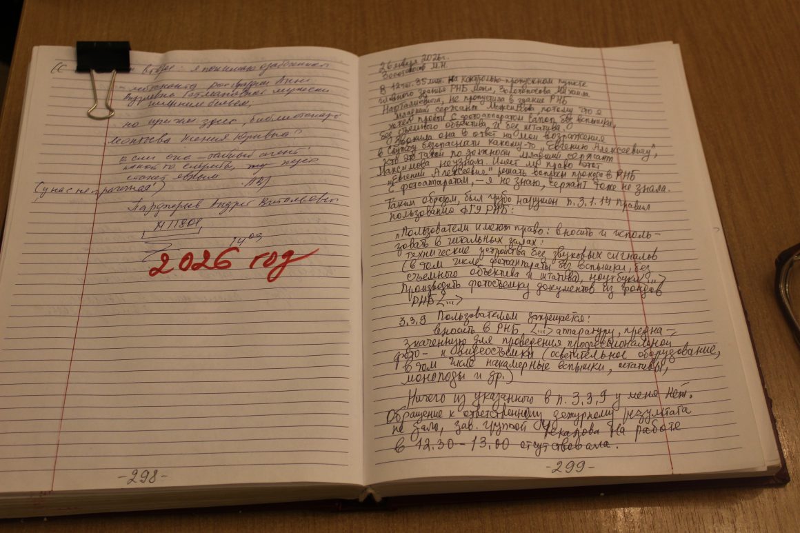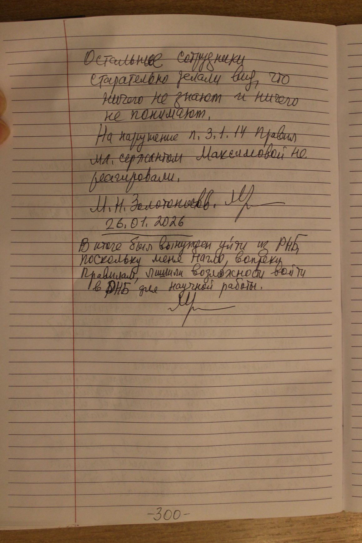 То, что работой РНБ теперь руководит младший сержант полиции Максимова, я выяснил случайно, когда 26 января 2026 года в 12 час. 30 мин. приехал в главное здание.