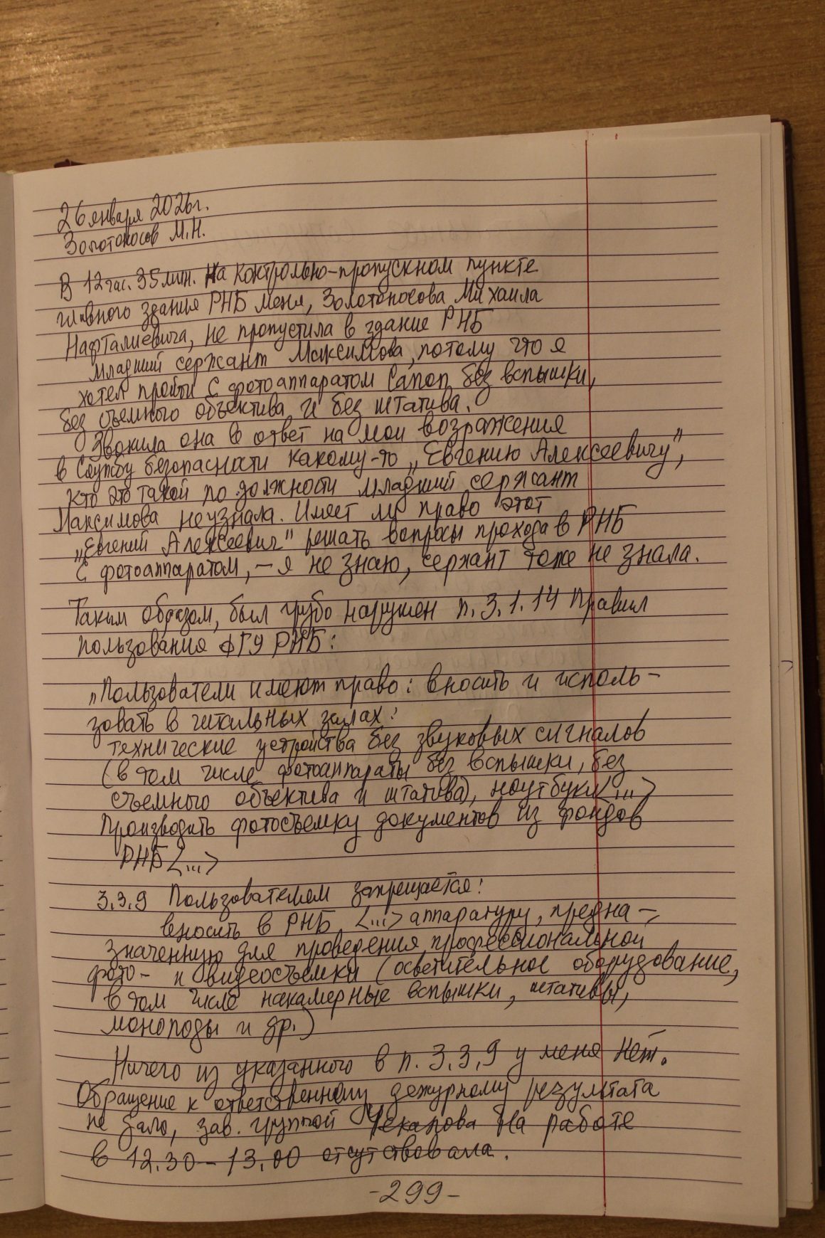 Поэтому профессиональный фотоаппарат (на самом деле – полупрофессиональный по его характеристикам) младший сержант Максимова путает с профессиональной фото- и видеосъемкой, действительно, запрещенной пунктом 3.3.9 Правил. Не гендиректор РНБ, не администрация РНБ, обязанная соблюдать Правила, а младший сержант Максимова – вот теперь администрация РНБ. Потому что она запретила мне входить в РНБ в нарушение Правил, и НИКТО во всей библиотеке, где полно начальников всякого ранга и уровня, не мог не только запретить младшему сержанту нарушать Правила, но даже сказать ей об этом. Абсолютная власть в РНБ принадлежит младшему сержанту Максимовой!