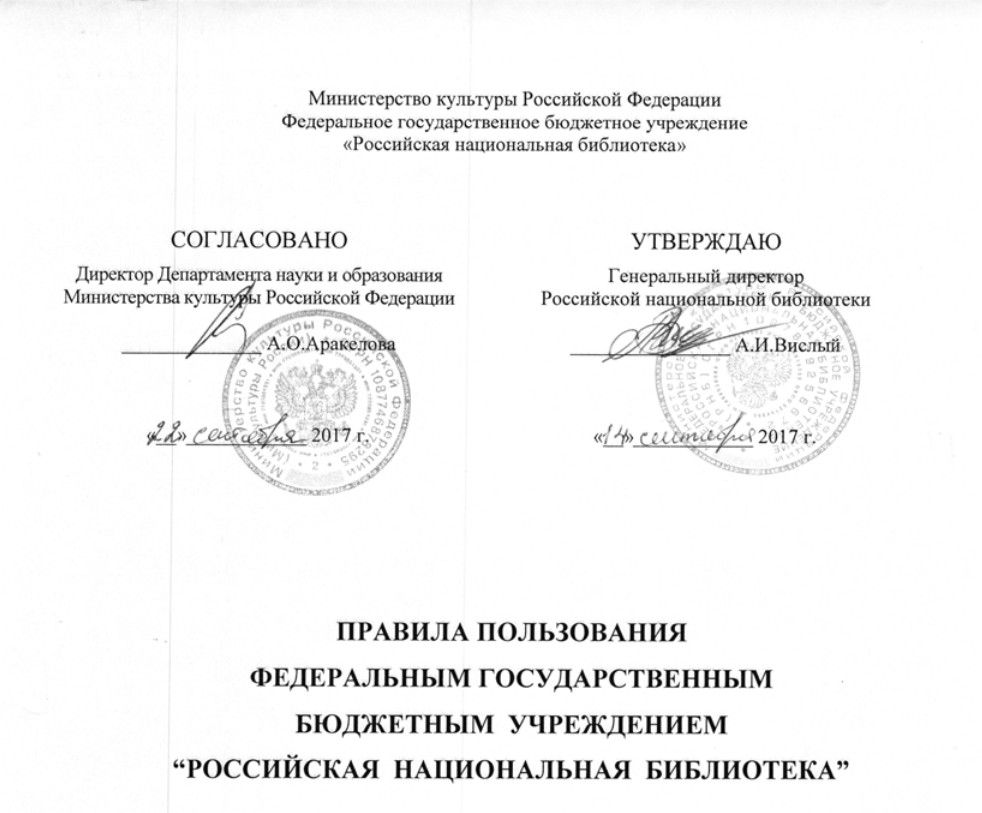 Работу читателей в РНБ регулируют «Правила пользования Федеральным государственным бюджетным учреждением “Российская национальная библиотека”» (далее – Правила), которые были утверждены 24 сентября 2017 г. и согласованы директором Департамента науки и образования Министерства культуры РФ.