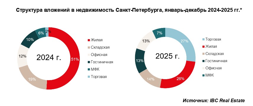 В 2025 году в структуре сделок лидируют торговая недвижимость (27%), жилье (26%) и складской сегмент (14%). Доли гостиничного и офисного сегментов составляют по 13% каждая, многофункциональных комплексов – 7%.