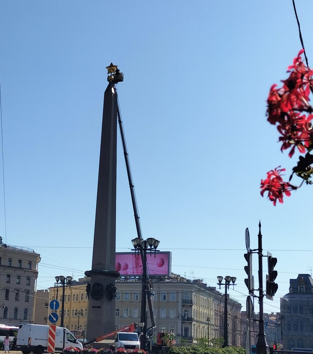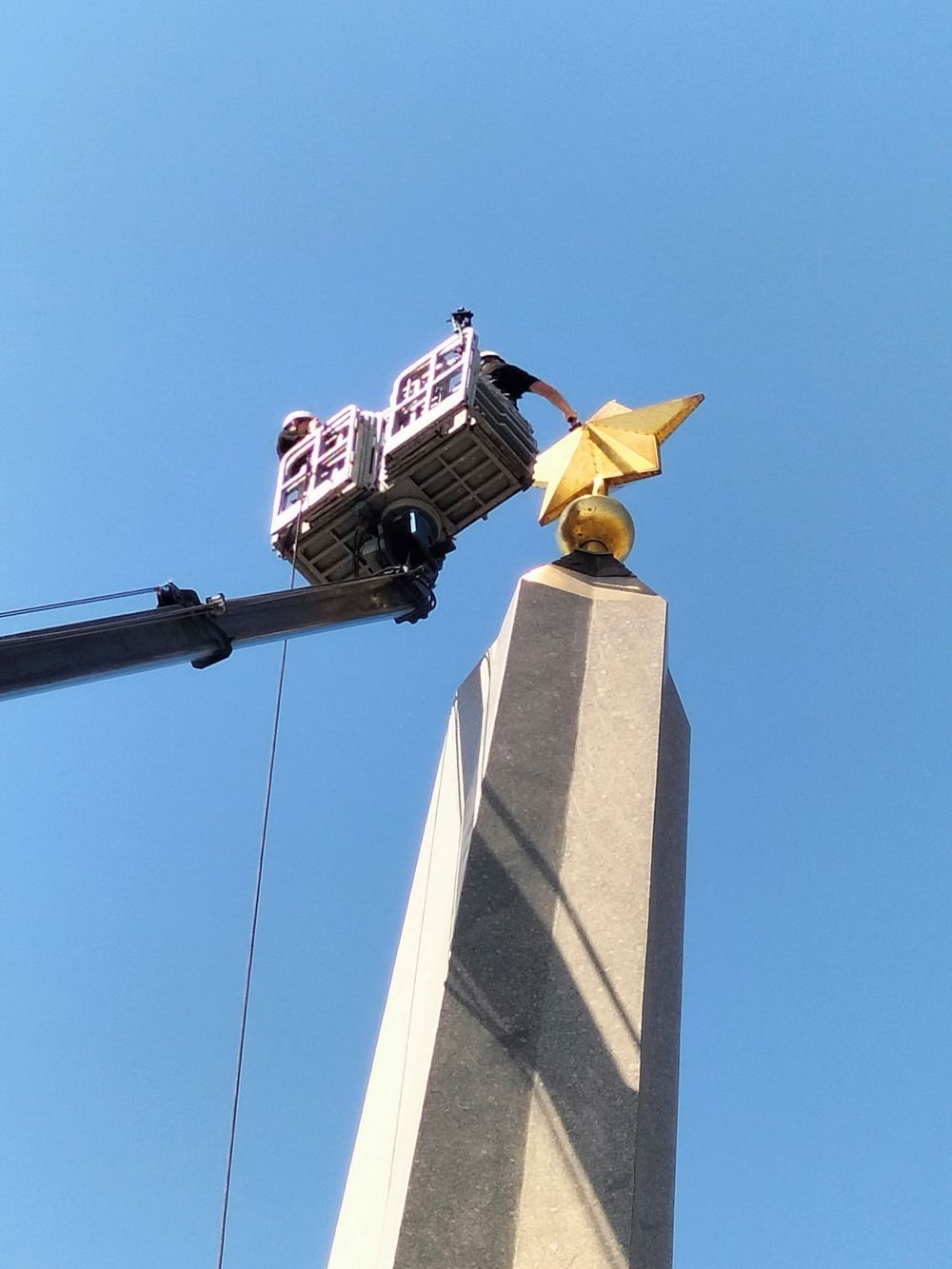 Первый поднялся к звезде на высоту 34 метра Алексей Сальников, реставратор металла из Музея городской скульптуры. Спустившись, он сообщил, что крепеж элементов звезды, изготовленной из пластин нержавеющей стали находится в идеальном состоянии, также как и сами пластины и золочение звезды сусальным золотом. Обелиск был установлен 40 лет назад, звезду изготовили на Адмиралтейском заводе.
